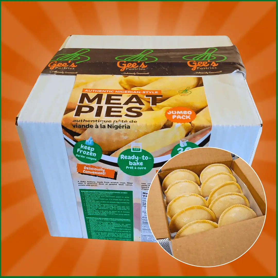 You get 15 Nigerian-style meat pies made with seasoned ground beef, and 15 rich, flavorful chicken pies wrapped in buttery crust. They are frozen fresh, ready to bake, and perfect for anyone who loves variety without the hassle.